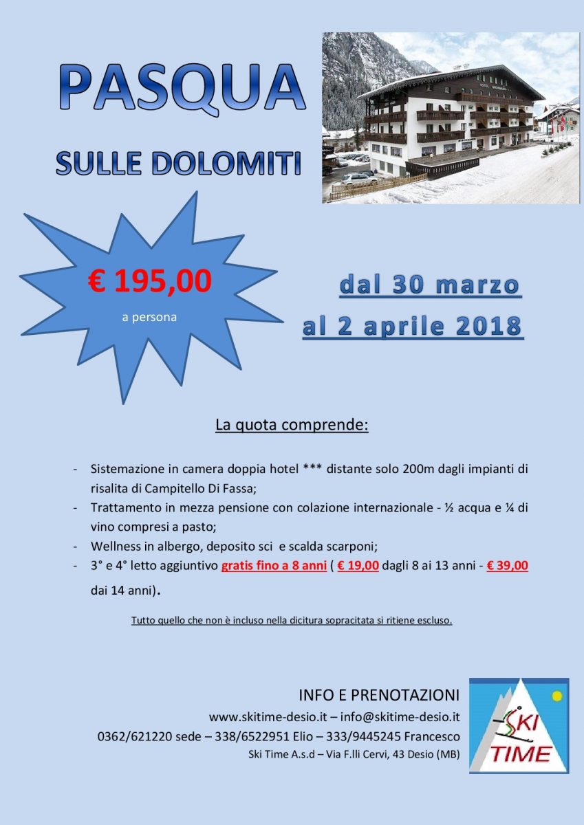 Ski Time A.S.D. organizza, come di consueto, pasqua 2016 (dal 25 al 28 Marzo 2016) sulle Dolomiti, a Campitello di Fassa/Canazei in Hotel a 3 stelle. PREZZO AI SOCI: € 197,00 a persona La quota comprende: sistemazione in camera doppia, per 3 giorni: venerdi, sabato e domenica; trattamento mezza pensione, compreso 1/4 di vino della…